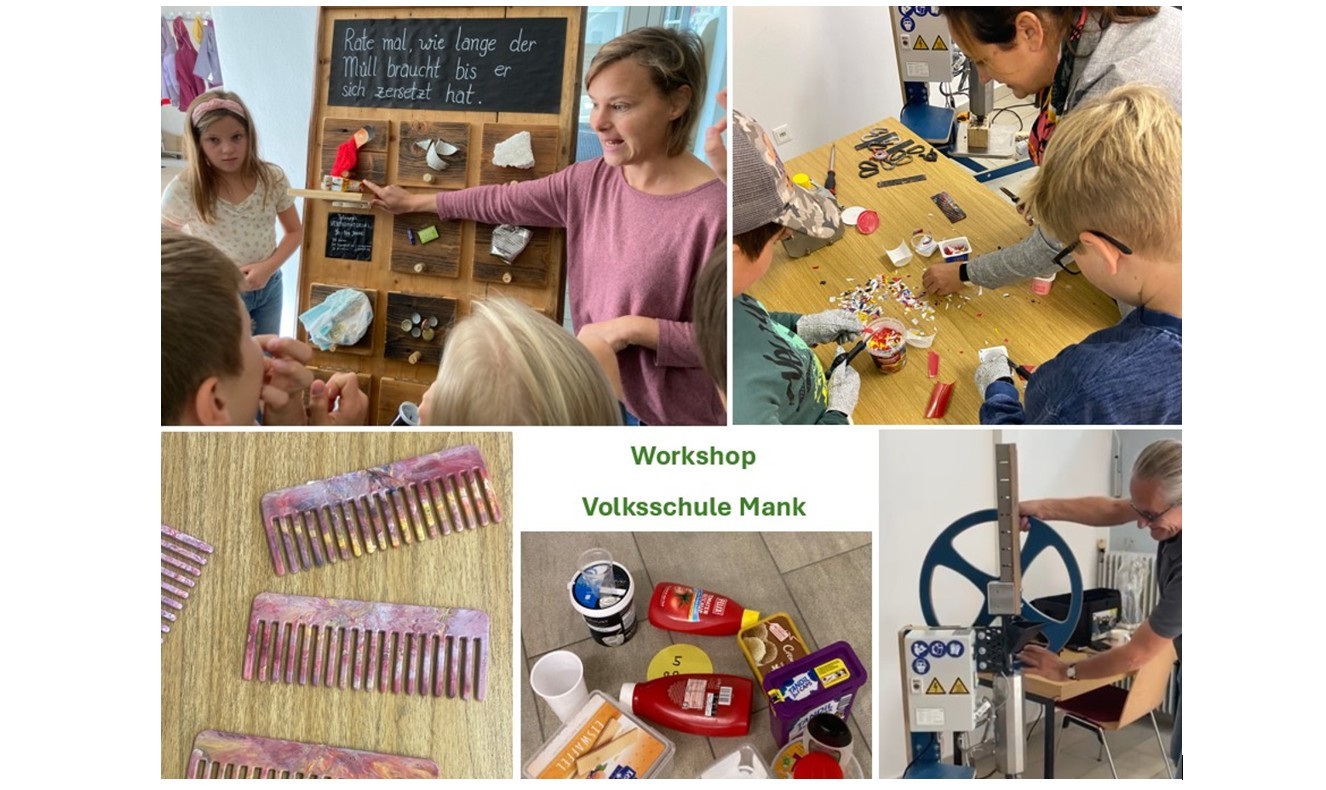 Zunächst wurden Recyclingcodes für Kunststoffe erklärt und die mitgebrachten Verpackungen richtig zugeordnet. Anschließend wurden diese gemeinsam zerkleinert und als Schnipsel in die Spritzgussmaschine gegeben. Dort wurden sie erhitzt, verflüssigt und in verschiedene Formen gepresst. Die fertigen Kämme, Karabiner und Klammern aus recyceltem Material waren für die Kinder ein echtes Highlight.